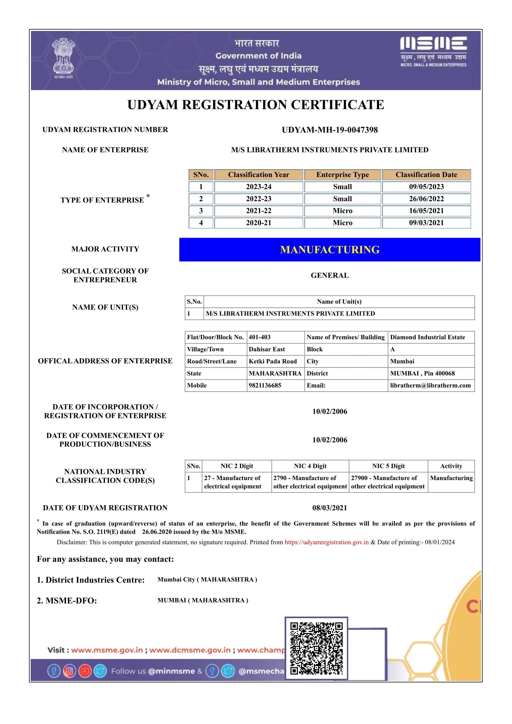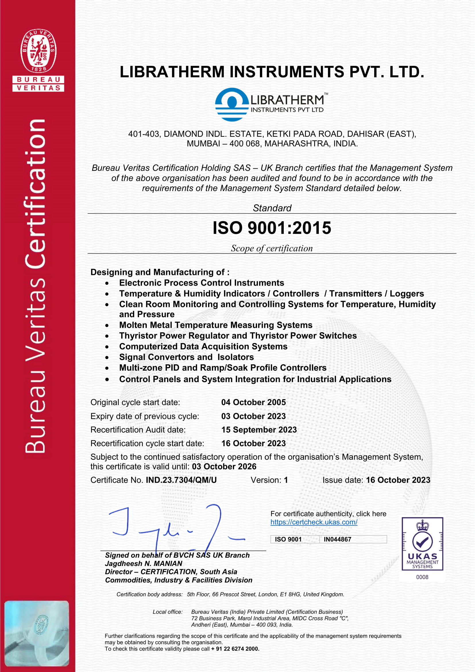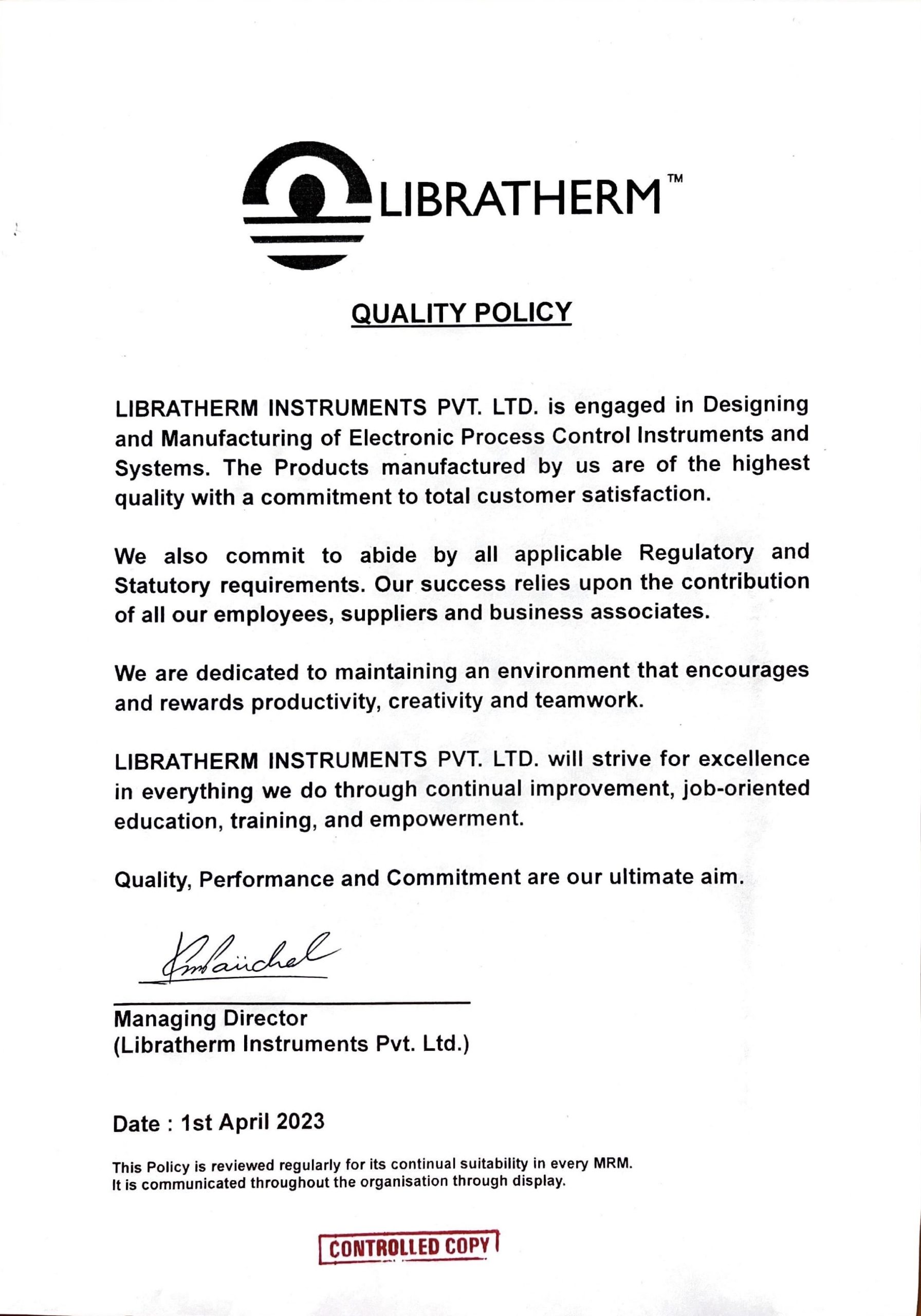 LIBRATHERM is an ISO 9001:2015 certified Indian Company engaged in the manufacturing activity of Electronic Process Control Instruments since 1991. At Libratherm, the instruments and systems are designed and developed by highly qualified team of Engineers having experience of more than 20 years, with in-house Design and Development facilities for both hardware and software.